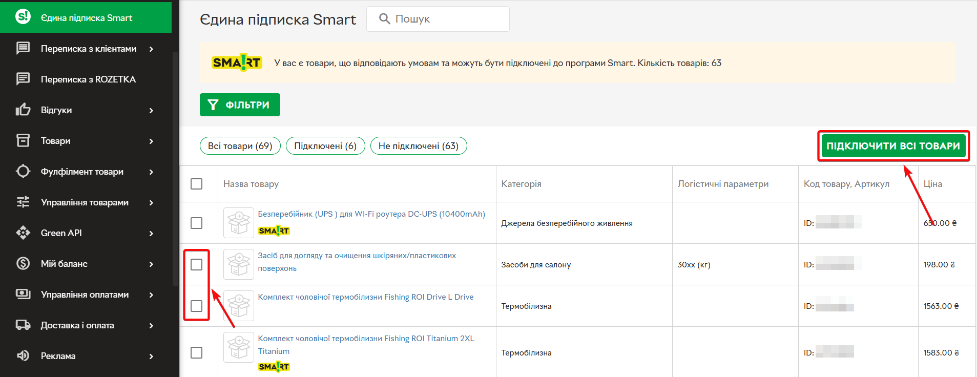 В кабінеті продавця відображається банер з кількістю товарів, які ви можете долучити до програми Smart. Щоб під’єднати товари перейдіть в розділ «Єдина підписка Smart» та натисніть кнопку «Підключити всі товари» або оберіть потрібні товари та натисніть кнопку «Підключити».