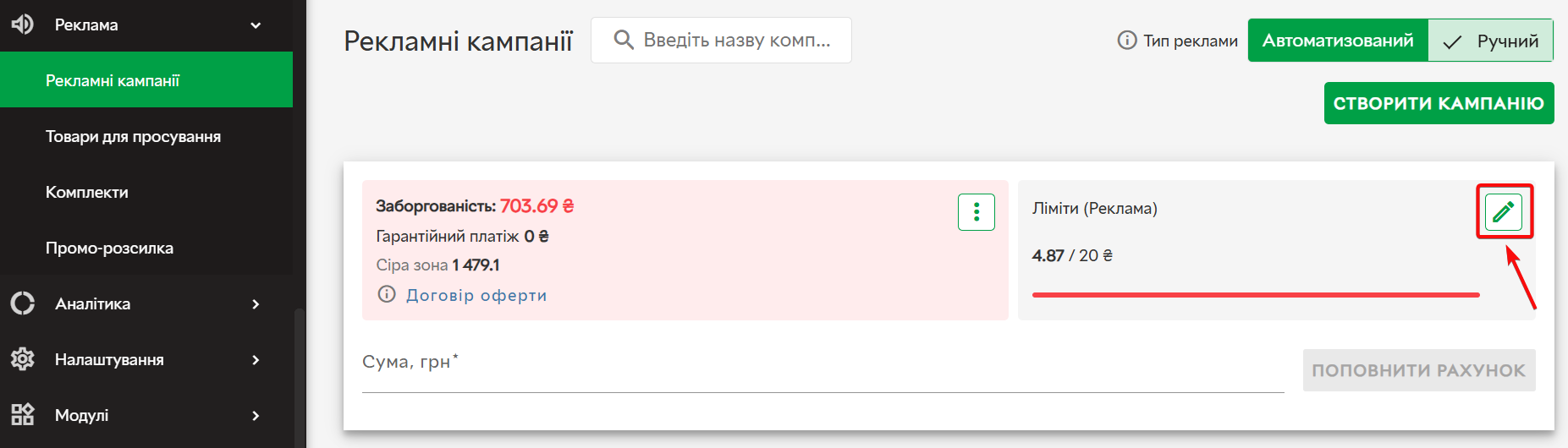 В кабінеті продавця вам необхідно встановити ліміт витрат на рекламу, для цього натисніть на зображення олівця в полі «Ліміти (Реклама)» та встановіть потрібне значення.